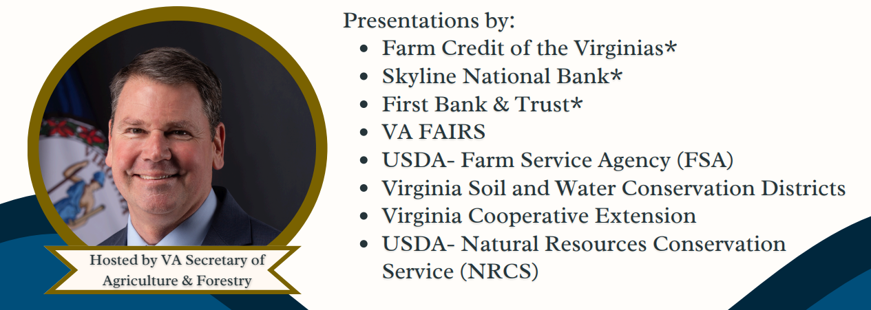 Click Here To RegisterSouthwest VirginiaHigher Education CenterOne Partnership Circle,Abingdon, VA 24210November, 12, 2025 / 9:00AM - 2:30PMFree event for beginning farmers to discover farm financing options and cost share conservation opportunities. Free lunch will be