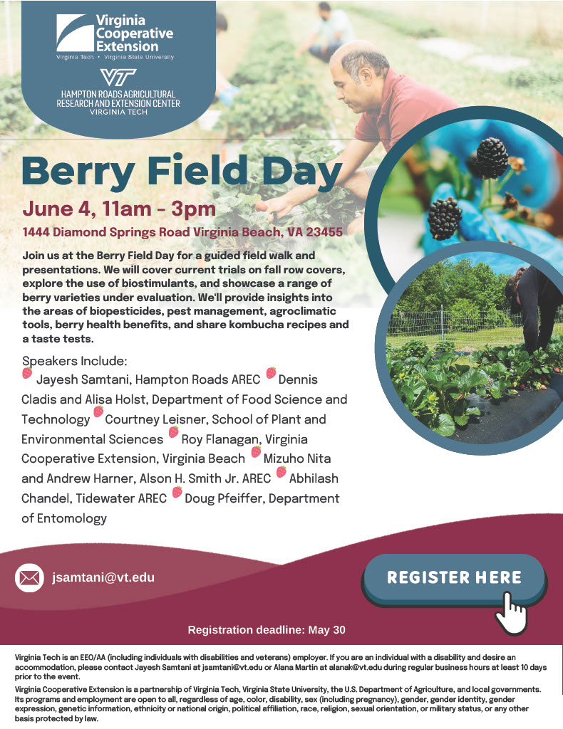 Berry field day @ Hampton Roads AREC View PDF Version Ty Dennis2025-05-02T18:57:12+00:00May 2nd, 2025|Field Day| Share This Article FacebookXRedditLinkedInWhatsAppPinterestVkEmail Related Posts Virginia Tech Southwest AREC Sheep Field Day & Ram Sale Virginia Tech Southwest AREC Sheep Field Day & Ram Sale Sweet Potato Workshop & Field Day Sweet Potato Workshop & Field Day