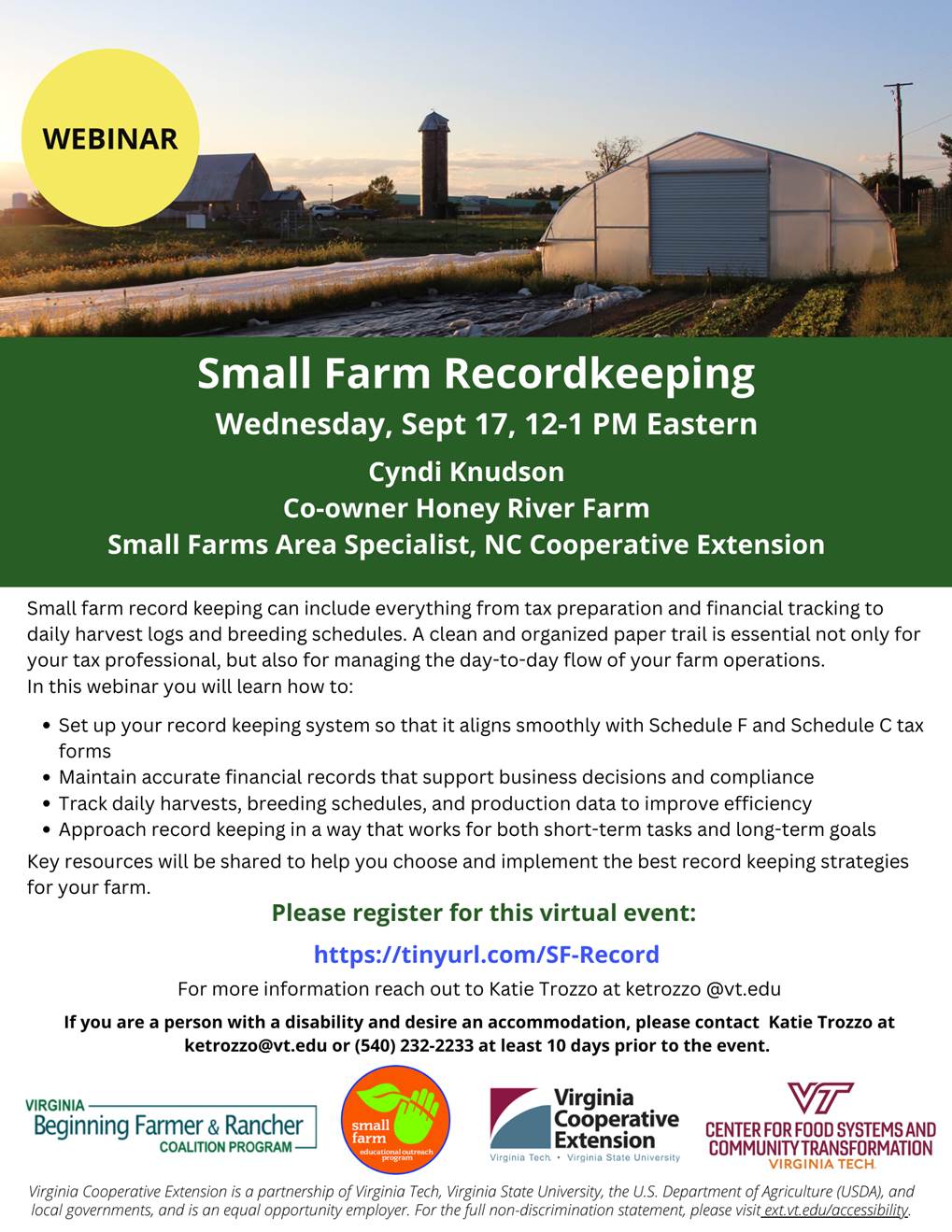 Sending a reminder for our Small Farm Recordkeeping webinar on Wednesday, September 17 from 12-1 pm, featuring Cyndi Knudson, Co-owner of Honey River Farm and Small Farms Area Specialist with NC Cooperative Extension. Small farm record keeping can include everything from tax preparation and financial tracking to daily harvest logs and breeding schedules. A clean and organized paper trail is essential not only for your tax professional, but also for managing the day-to-day flow of your farm operations.